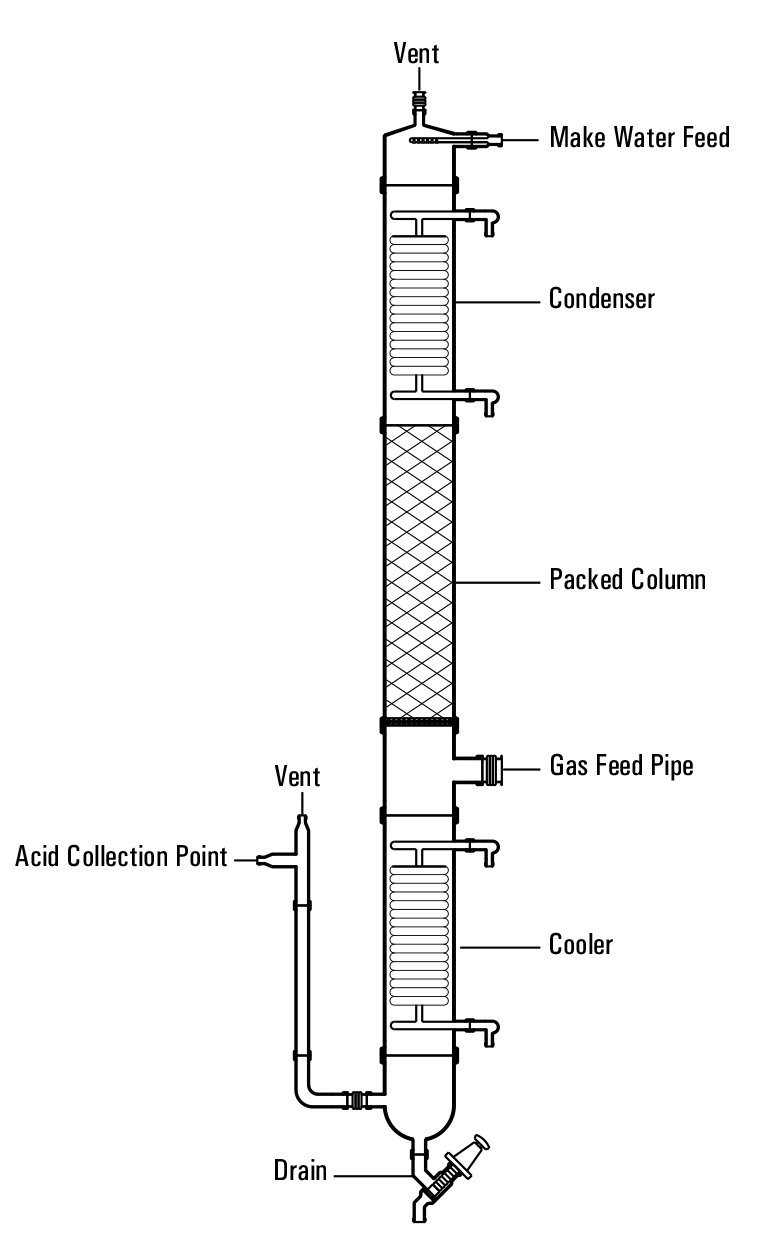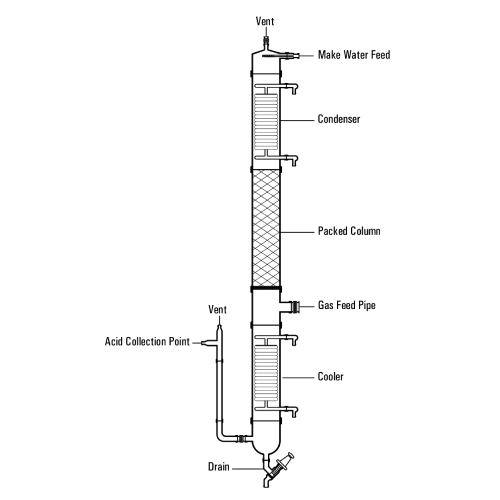HCl absorption columns are used for absorption of Hydrochloric gas, which statutorily are not permitted to vent in to the atmosphere, and to produce the HCl acid. The column is constructed with a series of packed sections, a gas introduction point below that, a condenser on the top, and a cooler at the bottom. Make water is sprayed from the top and acid is collected from the bottom.