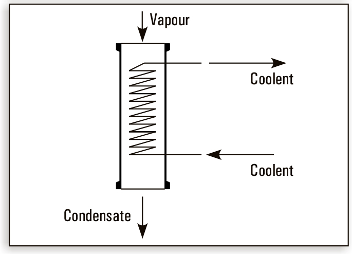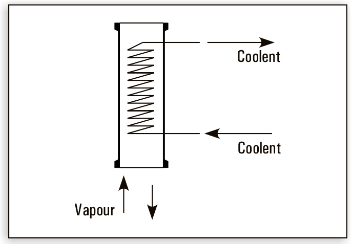 This method is simple to install over a reactor. However this results in condensate returning substantially at its condensing temperature. In this method care must be taken that condensate is not excessive that it can lead to “logging” the coils and create back pressure in the system. Generally a reflux divider is used below the condenser to take out the distillate.