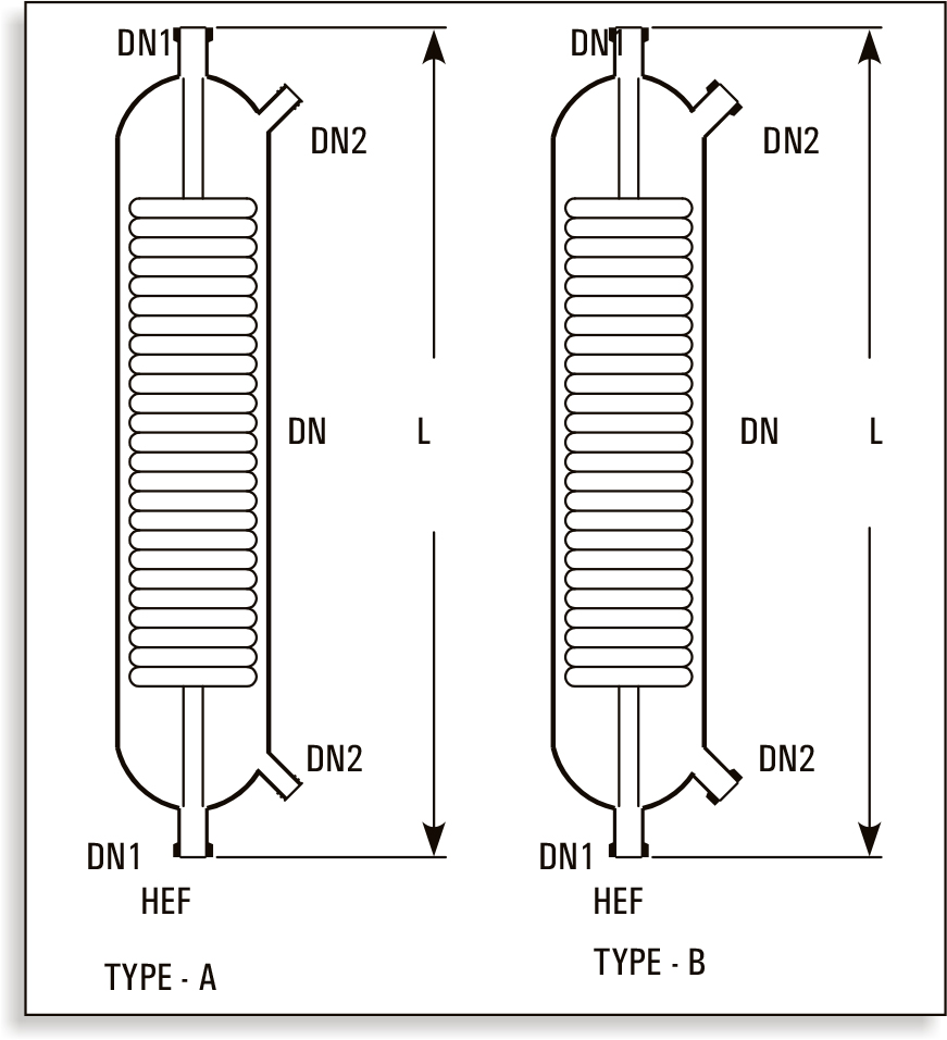 Immersion heat exchangers are used to control exothermic reaction in glass vessels. They can be used with vessels having wider bottom outlet (type VSR and VSE). These are provided with a central hole through the coil battery so that a special, extended type, stirrer can be fitted which extends to the bottom of heat exchanger and provide through action.