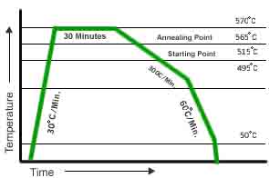 Annealing of glass is the process where the glass is heated and kept for a defined period of time to relive internal stresses. Careful cooling under controlled conditions is essential to ensure that no stresses are reintroduced by chilling/cooling.
